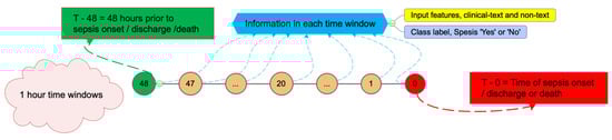 We used the Sepsis-3 clinical criteria [,] to define sepsis. With these criteria, the sepsis onset time is regarded as the latest time-window where both organ dysfunction and suspected infection criteria are satisfied. Suspected infection is fulfilled when at least two doses of antimicrobial treatment are given and any culture taking test is ordered. If the antimicrobial treatment is given first, then the culture test must be conducted within 24 h. On the other hand, if the culture test was conducted first then the antimicrobial treatment must be initiated within 72 h after the culture test. Organ dysfunction is measured by the sequential organ failure assessment (SOFA) score []. If the SOFA score is greater than or equal to 2 points from its baseline then the condition is denoted as organ dysfunction. Organ dysfunction is needed to be measured 48 h before to 24 h after the occurrence of the suspected infection. The baseline should be considered as the latest value measured before the 72 h time-window. If there is no known pre-existing organ dysfunction then the baseline should be regarded as zero. As the data are obtained from an intensive care unit (ICU)-based dataset, we can view the sepsis cases as a combination of community-acquired and hospital-acquired cases.