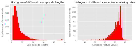 Patients older than 15 years were considered and the data were taken up until the first sepsis onset (see Section 3.1.2 for details), death or being discharged from the hospital. From this end point up until 48 h of continuous data were considered. We denote one such continuous event as a care episode where the total time (maximum of 48 h) is binned into one hour intervals. This interval is denoted as the time-window. Figure 1 illustrates one care episode with 48 one-hour time-windows. One should notice that the care episode length (total time) varies as can be seen in Figure 2.