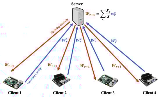 The security and privacy issue can be handled using the federated learning (FL) concept. FL can be described as different distributed ML approaches where the data are distributed among several individual devices. The training process of these data is specific to the respective devices only. Usually, a central server is used to manage the whole training process, but it is strictly enforced that this server is never allowed to view or obtain the data. The challenging part is effectively aggregating different locally trained models to improve overall performance []. FL is practical, operational cost saving, secure as the ownership control can be fully employed, and private as the absolute minimum usage or exposure of the data is allowed [,].