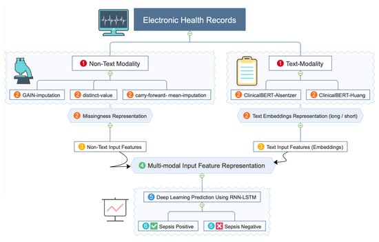 We used several state-of-the-art machine learning methods for the experiments. Recurrent neural network-based long short-term memory networks (RNN-LSTM) [,] were used for the sepsis prediction task. Generative adversarial imputation nets (GAINs) [] were used for the missing non-text data imputation. Two different bidirectional encoder representations [,] from transformers (BERTs) [] models were used to generate text embeddings from the clinical-text data.