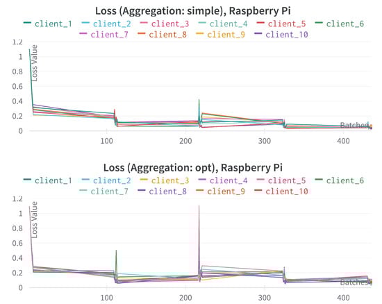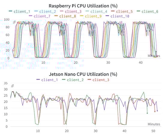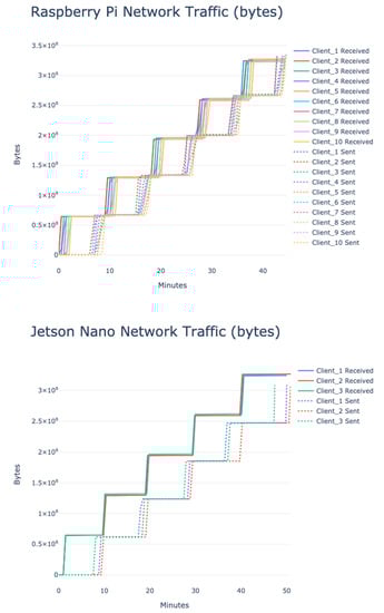Figure 14 provides the network traffic comparison for different Raspberry Pi and Jetson Nano devices. The data-size pattern is very similar as we exchanged the same types of information for every round. If the model is more complex, the data size will be bigger. Therefore, network usage should be carefully constructed and monitored.