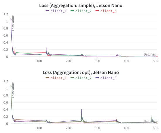 Kairouz et al. [] provided an in-depth overview of the advances and open problems in FL. One key challenge identified in the platform development and deployment area is the difference in hardware among different devices. They mainly focused on the performance and device stability and mentioned that running computation must not affect it. Communication, storage, and computational capabilities of different devices are categorized as a core challenge in an FL setting by Li et al. []. Their primary concerns were the power (battery level) and hardware (CPU (central processing unit), memory). Scarce computational resources and relatively small storage capacity of the devices are mentioned by Bonawitz et al. [], discussing the scaling issue of federated learning with the practical system design case. Gao et al. [] used Raspberry Pi devices and investigated the performance of speech commands and electrocardiogram-related tasks in the FL setup. Orescanin et al. [] investigated the fine-tuning performance in FL setting using Raspberry Pi devices using a pre-trained MobileNetV2 model on the CelebA dataset. The comparison of different edge devices was not performed in these works. The abovementioned discussions indicate the challenges to using low-end computational devices and highlight why it should be explored more in an FL setting to obtain the best performance.