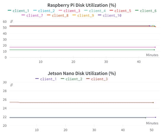 Disk utilization comparison for different Raspberry Pi and Jetson Nano devices. The x-axis represents the time in minutes, the y-axis represents the disk utilization percentage (%).