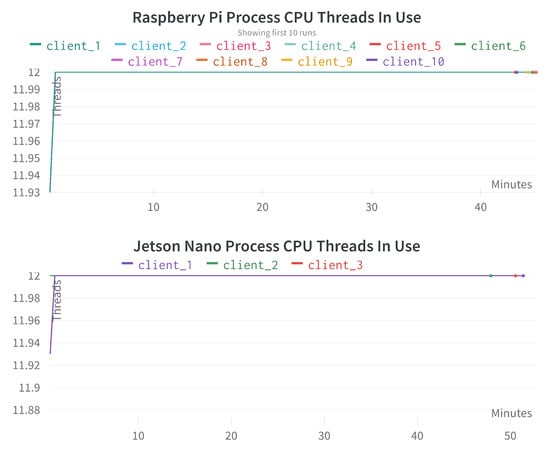 Figure 10 provides the comparison regarding the number of ’CPU process threads in use’ for different Raspberry Pi and Jetson Nano devices. We can see that it is entirely consistent across all the devices, and in almost all the cases, it is close to 12. It suggests that if we can effectively utilize all the cores of the CPU, then we may obtain a faster and better parallel performance, as can be seen in these graphs.