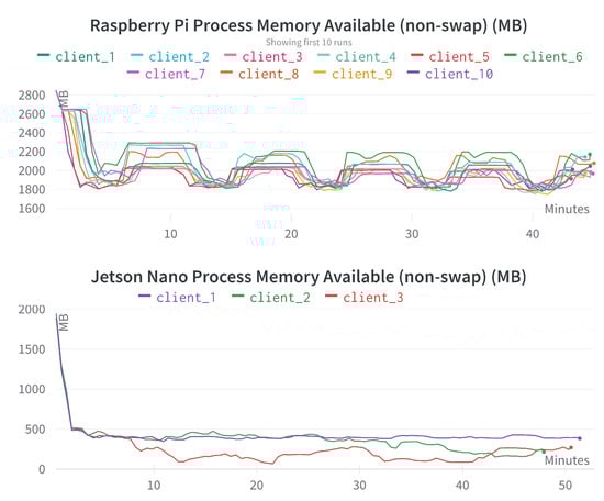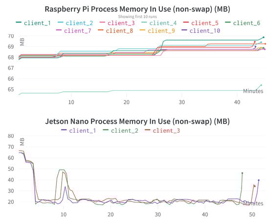 Figure 11 provides the comparison of process memory in use for different Raspberry Pi and Jetson Nano devices. Process memory is the collection of processes responsible for obtaining, preserving, and retrieving information. We can see that process memory utilization is relatively low in Raspberry Pi devices, and it is even much less (with a bit of irregularity) in Jetson Nano devices.