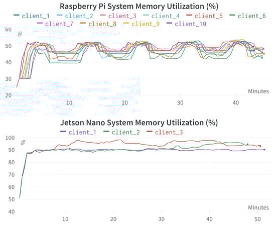 Figure 13 provides the system memory utilization comparison for different Raspberry Pi and Jetson Nano devices. System memory or random access memory (RAM) stores data and instructions temporarily so that the CPU can use it later by accessing it randomly. Similar to process memory, system memory utilization is also much higher in Jetson Nano devices than Raspberry Pi devices. We need to be very cautious about the dataset size (mini-batch size) and the complexity of the DL training model while utilizing Jetson Nano devices.