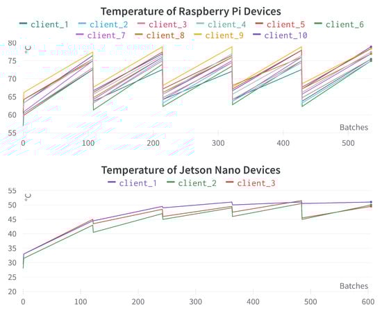 Temperature comparison for different Raspberry Pi and Jetson Nano devices. The x-axis represents the incremental number of training mini-batches, the y-axis represents temperature in Celsius (C).