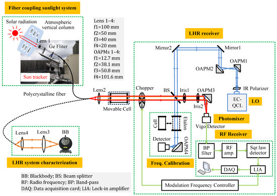 Measurement of the vertical concentration profiles of atmospheric trace gases is very important for understanding the physics, chemistry, dynamics, and radiation budget of the atmosphere as well as validating chemical models and satellite observations [1,2,3,4]. Laser heterodyne radiometer (LHR), as a kind of passive remote sensing technology, was introduced and developed in the 1970s to meet the needs of observing the ozone hole in the atmosphere [5,6,7]. Since then, LHR applications have been virtually silent, as a result of the lack of a suitable tunable laser source as the local oscillator (LO) for heterodyne measurements [8]. In the past 10 years, LHR technology has been revived due to significant advances in laser and photonic technology. Compared to the currently used ground-based Fourier-transform spectrometer (FTS) for measuring atmospheric trace gases, LHR is advantageous in terms of high spectral resolution (<0.001 cm−1), high sensitivity (within a factor of ~2 of the quantum noise limit), and high spatial resolution due to its very small coherent field of view and cost-effective compact instrument size [8,9].