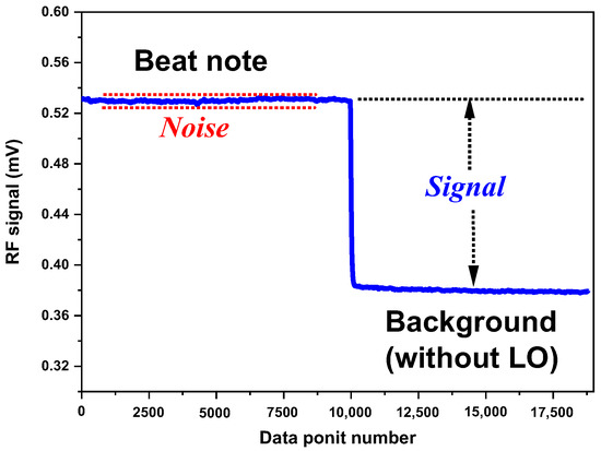 Comparing the RF output (after the associated amplifier to the photodetector) of the photomixer with both the LO and BB radiation injections (Figure 3, black curve) to that of the photomixer with only the LO injection (Figure 3, green curve), the two signals were almost overlapped, which indicates that there was almost no additional noise contribution from the BB radiation, i.e., signal-induced noise NSIN can be neglected at this stage of analysis.