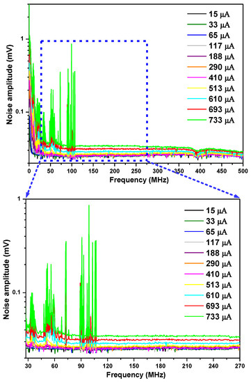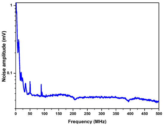 Given the readings from the signal analyzer at 150 MHz, 0.00709 mV for the noise amplitude of the signal analyzer’s background noise (Figure 3, blue curve) and 0.02370 mV for the noise amplitude (Figure 3, red curve), resulting from the signal analyzer background noise and the detection chain noise, respectively, the detection chain noise amplitude of 0.02261 mV can be deduced. This was the integrated detection chain noise level within the set resolution bandwidth (RBW) of 100 kHz; the corresponding detection chain noise density NDet was, thus, 71.5 .