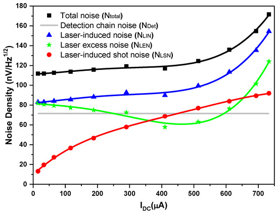 The laser excess noise NLEN (Figure 5, green star) can then be calculated using Equations (3) and (9), that is, by subtracting the laser-induced shot noise NLSN (Figure 5, red circle) from the laser-induced noise NLIN (Figure 5, blue triangle).