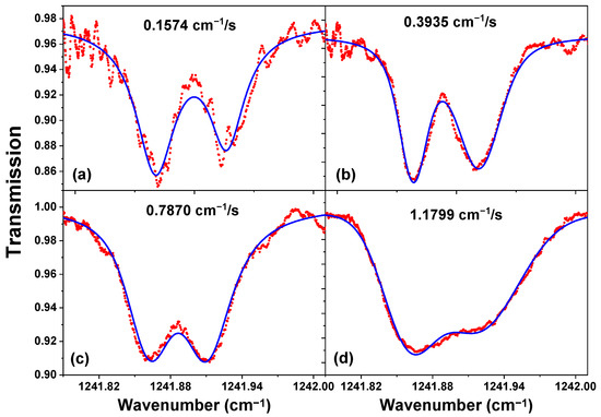 Heterodyne absorption spectra of CH4 (red) at scanning speeds of 0.1574 cm−1/s (a), 0.3935 cm−1/s (b), 0.7870 cm−1/s (c),and 1.1799 cm−1/s (d), respectively, fitted with Voigt profiles (blue).