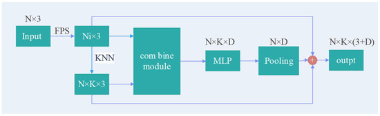 The input in Figure 4 is N point clouds containing xi, yi, and zi spatial coordinate information. Ni sample center points are obtained under FPS, and neighborhood points are obtained under KNN. Then, the encoding method of the spatial feature information of each sampling center point Ni is as follows: