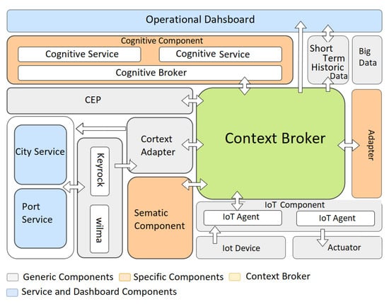 Figure 1 shows a diagram that groups the different components in colors differentiating the generic components, specific components, the context broker and the dashboards and external services.