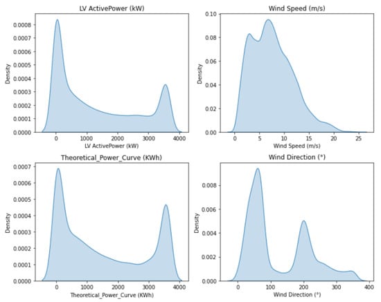 The distribution of the values for the respective columns is shown below. The analysis used to remove wind data when the turbine is operating abnormally, such as when there is wind reduction and blade damage, will mitigate the negative effects of these abnormally high values in the training phases of the power curve model. However, it cannot be guaranteed that various types of outliers will be found and handled during the data preprocessing phase. As a result, certain hidden anomalies will still be present in the data. As a result, the distribution of errors in the modeled data for the harmonic power curve will be asymmetrical as seen in Figure 2.