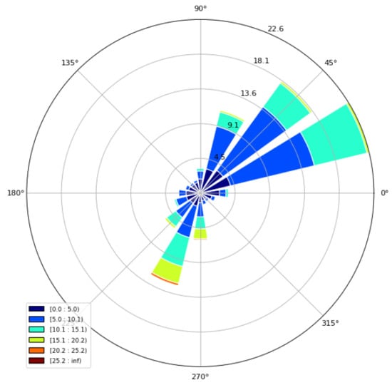 Below is a graph showing the wind speed and wind direction for the different measurements: The annual frequency distribution of observed wind direction and wind speed representing the relatively calm wind field at the upper boundary is seen in the wind rose in Figure 3. This analysis reveals the main flow directions in the area to be northeast, east and southwest, which is typical for the area. Therefore, the model study below focuses on the main wind directions northeast (45°), east (25°) and southwest (250°, as the 270° and 225° wind direction intervals are represented with similar frequency).