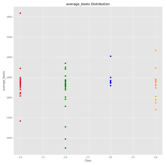 The exploratory data analysis step was performed after extracting the audio features from the dataset. The main goal of this step was to determine which characteristics could be used as strong indicators to make an accurate prediction. The distribution of each variable was graphically plotted and then analyzed (as shown in Figure 3 for average beats).