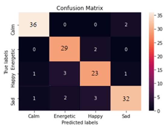 With a final accuracy score of 94% and an examination of the Confusion Matrix, the model classified calm, happy, and energetic songs very well, but the accuracy for sad songs was slightly lower at 85%. It also attempted to improve the model’s accuracy by modifying some parameters, such as batch size, number of epochs, and the aggregation or deletion of some features used to train the model.