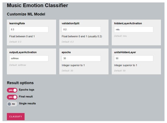 The classification algorithm’s default parameters are defined in the JavaScript file, but they can be changed by the user via the web application’s user interface (UI). The following parameters had default values: number of epochs, learning rate, test data set size, number of hidden units, and activation function for both hidden and output layers.