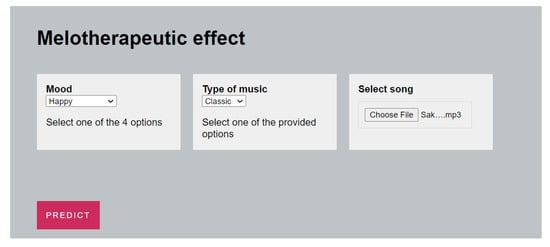Another web application was developed, allowing the music therapists to select (i) some characteristics for the patient, (ii) a song, and, based on the trained Machine Learning Model described above, the app will be able to indicate whether that specific song will have a therapeutical effect for the patient.