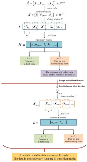However, the MADF test alone cannot realize mode identification for process data. If we use the MADF test directly on a whole dataset with multiple modes without distinguishing between them, we will obtain incorrect test results, which cannot be reflected when the process enters a new mode. Only after the process data are divided can mode identification be realized by the MADF test. The result of mode identification is closely related to the length of the selected partition. Therefore, this paper combines the MADF test with a variable-length sliding window and finally proposes the VLSW-MADF test for modal identification. The approximate framework of the method is as follows: First, a window of length is used to divide the trend variables of the given data, and then the ADF test is used for rough mode identification. Rough mode identification can be used to roughly distinguish stable modes from transition modes. Then, a window of length is used to divide the trend variables, and the ADF test is used for detailed mode identification. Detailed mode identification can be used to determine the beginning and end of a transition mode. Finally, mode identification is realized for the multimodal process.