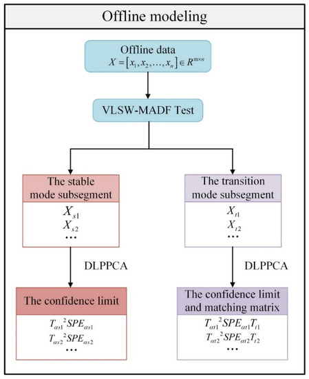 Step 6: Similar to Step 5, DLPPCA is also used to model the stable mode subblocks. Taking subsegment as an example, DLPPCA is used to model and obtain the confidence limit and . In the subsequent online mode identification step, it is not necessary to use the matching matrices of the stable modes, so only the confidence limit needs to be saved here. A flowchart of the offline modeling is shown in Figure 2.
