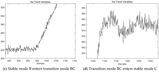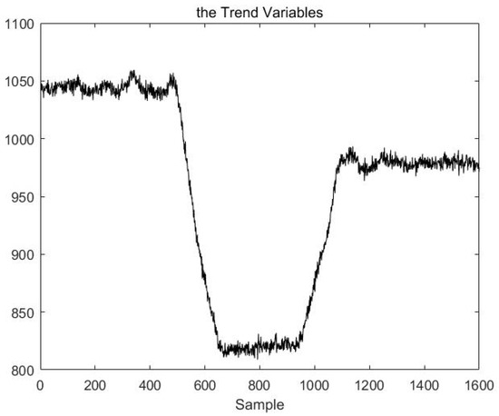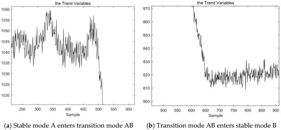 The traditional ADF test introduced in Section 3.1 can only test the stationarity of a single variable. The production data from actual industrial processes are multivariable. As a result, the ADF test cannot be directly applied to industrial process data. However, in pattern recognition, the work that must be carried out is to recognize a pattern according to the changing trend of each variable. If we can extract a single variable that can represent the fluctuation trend of the multivariable industrial data, we can carry out pattern recognition through a stationarity analysis of the single variable. The single variable that can achieve this effect is called the trend variable of the process. This paper proposes a method of using mean value processing to extract the trend variables of a given process. We find that when the process is in a stable mode, the mean value of each sampling point also remains relatively stable; when the process is in a transitional mode, the mean value of each sampling point likewise fluctuates. The trend variables of the process extracted by the mean processing method can reflect the change trend of the process data accurately. The method for extracting the trend variable is described in detail in the second half of this section.