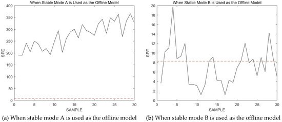 For the initial phase of a process, since there are no data from the sample points at the previous moment to use as references, the corresponding model for the starting phase needs to be determined. Here, the minimum principle is used to determine that for a data segment with a starting length of ; the online data are monitored in turn using known historically stable modes. The model with the lowest for online samples is selected for monitoring.