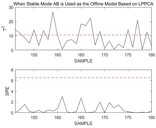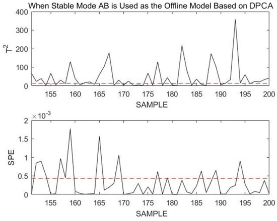 Next, another comparative simulation is used to illustrate the necessity of modeling stable modes and transition modes separately. This comparative simulation uses the DLPPCA method to perform overall offline modeling on the process containing stable mode A, stable mode B, transition mode AB, and transition mode BA without distinguishing between them.
