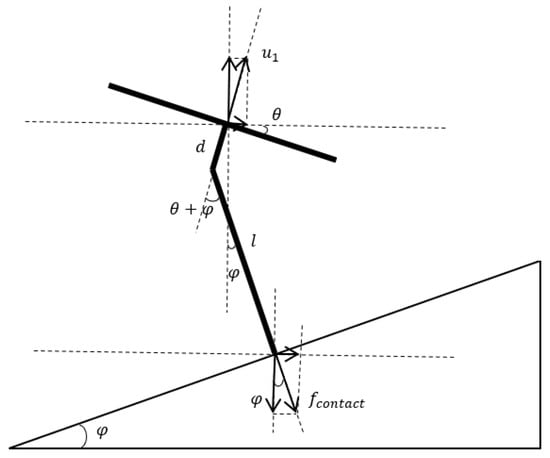 where is the length of the manipulator, and is the distance from the base of the manipulator to the center of the quadrotor. The expression of the contact force can be derived as follows: