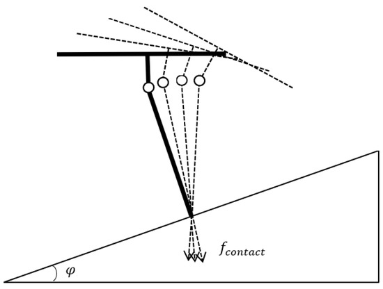 It can be noticed that the contact force is decided by four parameters, , , , and . Since the former three parameters are constant, the contact force always corresponds to a pitch angle. However, if the pitch angle alters without adjusting the angle of the manipulator, the manipulator will no longer be perpendicular to the target and cause separation eventually. The analysis of this process is shown in Figure 3.