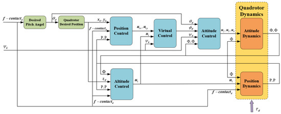Since the sampling frequency of the gyroscope and accelerometer in the flight controller is distinct, this research chooses the inner and outer loop control strategy for the quadrotor platform, in which the outer loop is the position control, and the inner loop is the attitude control. With the desired force , the desired pitch angle and position can be calculated according to Equations (6) and (7). However, the quadrotor is an under-actuated system, and its horizontal position and Euler angle are coupled, so it is necessary to design the virtual controller of to derive the expected value . Then, with the desired pitch angle , the roll and pitch controller can be designed. As the UAM’s altitude and yaw angle are not coupled to other states, their controllers can be designed directly. The structure of the control system is depicted in Figure 4.