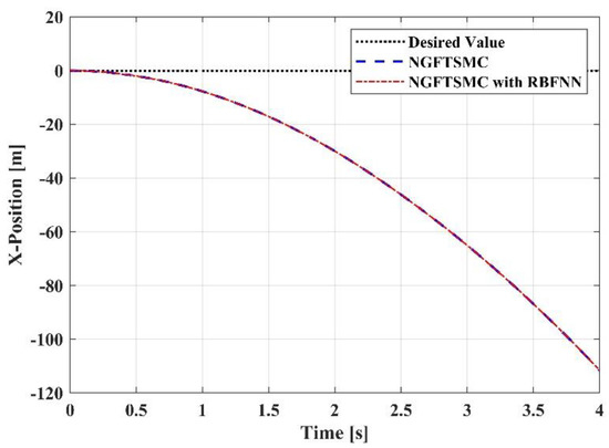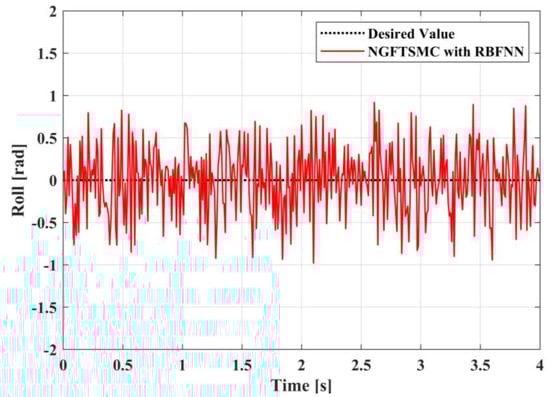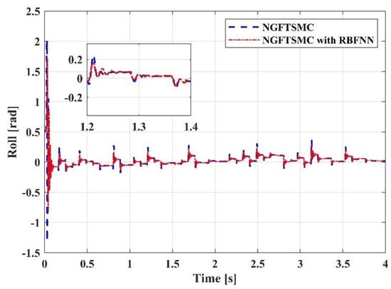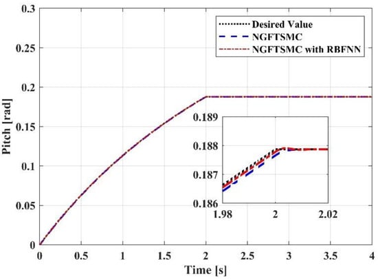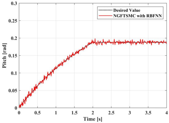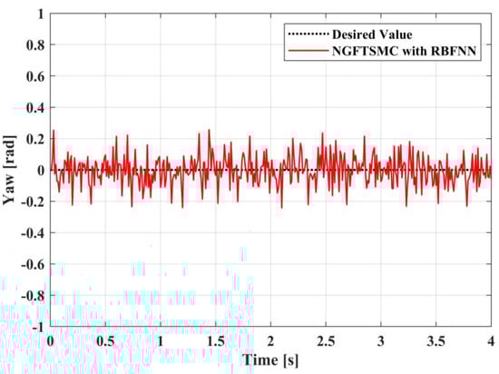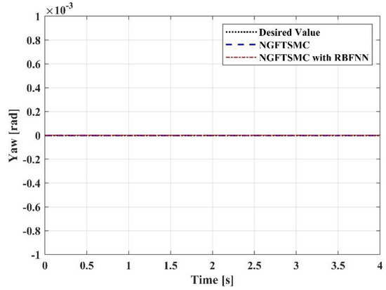 Figure 9, Figure 10 and Figure 11 portray the variation in the system Euler angles over time. Since the roll angle is coupled with the motion in the y-axis direction, the changing pattern in the roll angle should be similar to the trajectory of the system in the y-axis direction. It can be noticed from Figure 9 that the variation in the roll angle of the RBFNN-based NGFTSMC system is slighter than that of the NGFTSMC system. The compensation of the neural network can decrease the influence of random disturbances, and the simulation results are compatible with the analysis. The pitch angle is coupled with the motion of the system in the x-axis direction. Since the trajectory on the x-axis is divergent, the acceleration always exists, and the desired value of the pitch angle is not zero. Therefore, as shown in Figure 10, the proposed controller can better track the system’s desired trajectory and converge to the equilibrium state faster than the NGFTSMC. Since the yaw angle is not coupled with other states, the system can control this state directly, which is advantageous to the system. This characteristic allows both systems controlled by the NGFTSMC and the RBFNN-based NGFTSMC in Figure 11 to exhibit outstanding control performance and effectively diminish the chattering of the system.