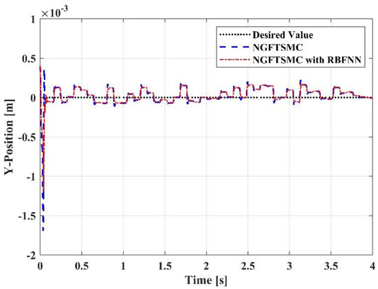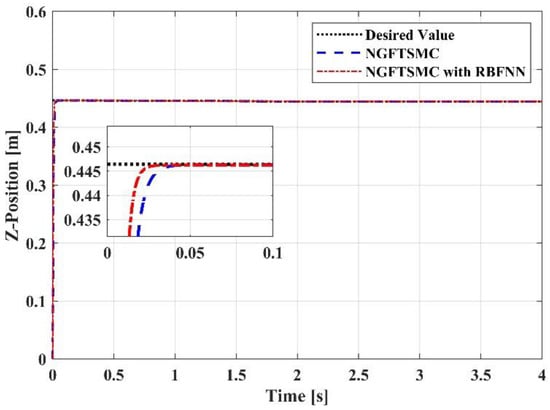 Figure 6 depicts the trajectory tracking of the controllers in the x-axis direction. After contact, the reaction force generated by the target will theoretically offset the force exerted by the end effector, so that the aerial manipulation system is limited in the x-axis direction. However, in the simulation, the target will not generate a reaction force, and the system has no limit in the x-axis direction. Therefore, it can be observed that the trajectories of the systems controlled by the two methods in the x-axis direction are divergent. The trajectory of the system controlled by the proposed controller can track the trajectory of the system controlled by the NGFTSMC accurately, and the error of the two is within 0.01 m. Figure 7 illustrates the trajectory tracking of the controllers in the y-axis direction. Due to the random disturbances added to the system, some fluctuations appear in the two systems. The trajectory of the RBFNN-based NGFTSMC system is similar to the NGFTSMC system but smoother, which indicates that the proposed controller has a superior anti-disturbance performance. Figure 8 describes the trajectory tracking of the controllers in the z-axis direction. It can be seen that the systems controlled by both controllers can track the desired trajectory of the system. Nonetheless, the system controlled by the NGFTSMC needs 0.04 s to reach the desired trajectory, while the RBFNN-based NGFTSMC only needs 0.03 s, indicating that the proposed controller has a better performance in convergence speed.