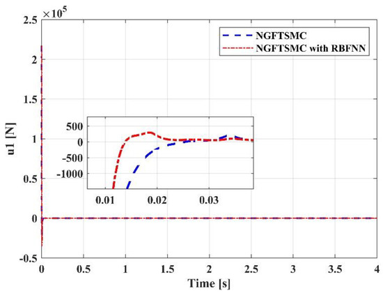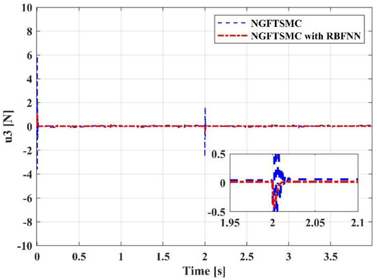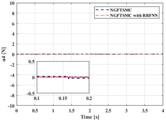 Figure 12 displays the performance of the control input . The response speed of the system controlled by the proposed controller is swifter than that of the system controlled by the NGFTSMC. Since represents the thrust of the system, it mainly affects the motion on the z-axis, so its performance is consistent with the trajectory tracking results in Figure 8. Figure 13, Figure 14 and Figure 15 are the traces of the system torque output by the controllers over time. Distinct from Figure 12, the torque output of the system, controlled by the NGFTSMC and based on the RBFNN, is around one-sixth of that of the NGFTSMC-controlled system; in addition, the frequency and amplitude of the fluctuations are less. This performance will reduce the wear of the mechanical components and have an eminent significance for the proposed controller application in the actual system.