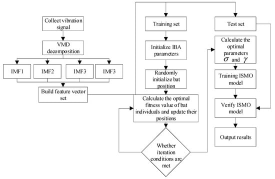 The study plans to decompose the original signal by VMD to obtain the intrinsic mode component (IMF) and to extract the sample entropy of each component as the eigenvalue of the bearing fault. The training set is input into the improved sequence minimum optimization algorithm (ISMO) model for training. At the same time, the penalty factor and Gaussian kernel parameters of the ISMO are optimized by an improved bat algorithm (IBA). The fault diagnosis model established in this study is shown in Figure 1.