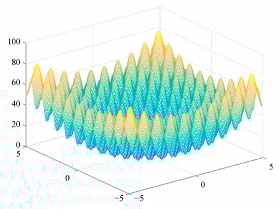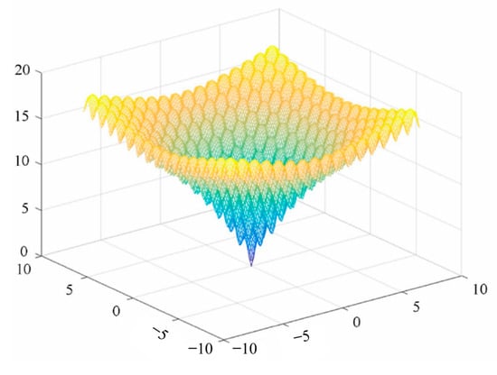 Among them, , , and the overall shape of the function is similar to that of the hills, which proves that the algorithm has a good ability for global optimization. The function image is shown in Figure 3: