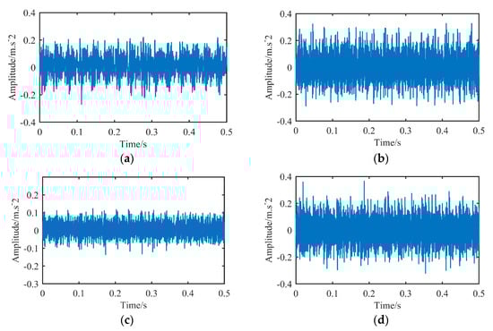 Vibration signals of rolling bearings in four states. (a) Normal state. (b) Inner ring fault. (c) Rolling body fault. (d) Outer ring fault.