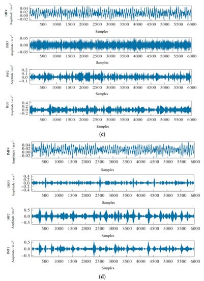 The vibration signals of four states in Figure 7 are decomposed by variational mode decomposition. Because the variational mode algorithm has the advantage of removing some redundant component information, as shown in Figure 8, four IMF component informations are obtained according to different time–frequency domain characteristics.
