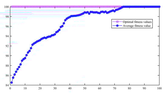 Three hundred sets of samples are selected from each group as the training, and the rest as the prediction set. Then, all the training sets are input into the IBA-ISMO algorithm, and the values of the penalty factor and kernel function parameter of the best fitness are obtained by IBA algorithm. The iterative process and the changing process of the evaluation function are shown in Figure 9. As can be seen from Figure 9, the evaluation function in IBA algorithm constantly calculates the fitness value produced by the matching of different penalty factor and kernel function parameter , and the fitness increases with the increase of the number of iterations until the optimal fitness value is obtained when the maximum number of iterations is close to the maximum number of iterations. At this time, the output fitness , .