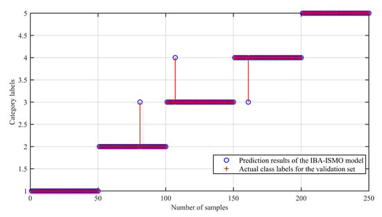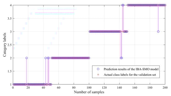 Figure 11 shows that IBA optimizes the fault identification accuracy of the traditional SMO model. It can be seen that there are misjudgments in some test sets, although the overall fault identification rate is 95.5%. Using the IBA-ISMO algorithm introduced in this study to re-train the training set samples and re-input the test set samples into the model derived by the IBA-ISMO algorithm, and the verification results are shown in Figure 12. Among them, class labels from 1 to 4 represent the normal state, inner ring fault, rolling fault and outer ring fault, respectively.