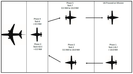 Aerial refueling has been an integral capability supporting both strategic and tactical aircraft within the DoD for decades [1]. Historically, it has relied heavily on the skills of highly trained human pilots for successful execution [43]. Improvements in both UA and modern sensor, robotic, and control technologies could now enable A3R in UA with an acceptable level of assurance and risk. To complete A3R, the UA must be able to perform all the functions of the pilot beginning at the initial rendezvous between the UA and the tanker aircraft and ending with the UA safely separating from the tanker to continue onto the next portion of the programmed mission. Using the current NATO guidance for A3R, the phases and tasks have been organized into five phases and seven tasks [44]. To enable a UA to complete A3R, at a high level, the UA and tanker must complete the following seven tasks (many of these tasks are supported by pilot skills in conventional aerial refueling):