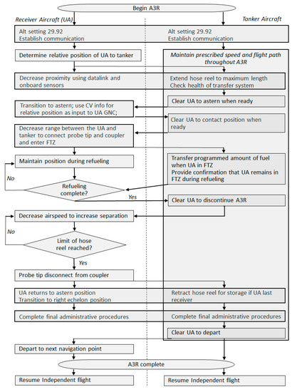 - Establish communications. Prior to initiation of refueling, communications and datalinks must be established between the UA and the tanker, and any supporting entities that are involved, such as the Ground Control Station (GCS) and Aerial Vehicle Operator (AVO). The GCS receives all pertinent data related to the A3R and the AVO monitors the performance of the UA (the AVO is analogous to a remote safety pilot). As technology advances, the role of the AVO will likely diminish as additional assurance in the system becomes available.