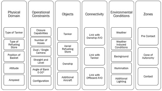 The UA must be able to complete all guidance and control tasks throughout the entire operational design domain (ODD) or the domain in which the system is intended to operate. The ODD of the UA will be determined by the desired flight envelope (airspeed, altitude, angle of attack, etc.) capabilities of both aircraft, the need to operate in different environmental conditions (rain, icing, etc.) and the requirements of the intended mission of the platform (daytime only, carrier based only, etc.). The ODD will drive not only the sensor requirements of the platform, but also the assurance requirements of the test program. An example ODD was built from guidance provided by the National Highway Safety and Transportation Administration (NHSTA) [46]; the ODD includes the six categories of physical domain, operational constraints, objects, connectivity, environmental conditions and zones that must be accounted for during the design and certification of a UA tasked with conducting A3R (Figure 10).