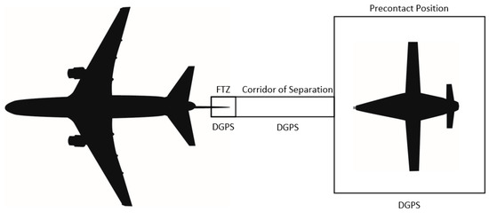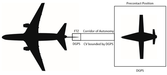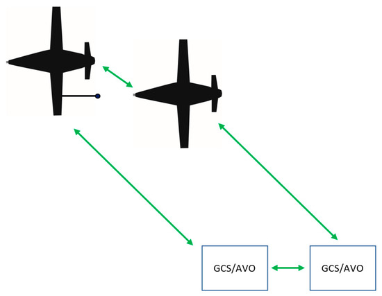 A data link to an AVO may be installed for redundancy and/or oversight, but it may not be required for operation. Unless the UA employs a computer vision (CV)-only solution with no fusion of additional location information, such as differential global positioning system (DGPS) data [29], a data link between the receiver and tanker is required for the transmission of position data. For this paper, it is assumed that a data link must exist between both the tanker and receiver, as well as between the AVO and the UAs (Figure 11).