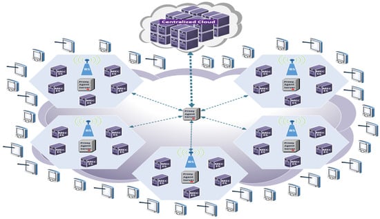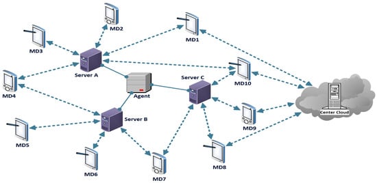 The discussed model in [] introduced four application, communication, and caching system structures for discussion and reference. It consists of a group of MEC servers with enabled computation tasks and caching services, a central agent server, and a connection to the main cloud servers. The MEC servers in each structure topology are distributed and surrounded randomly by multiple MDs within a particular coverage area. The MD is communicating with collective MEC servers within the coverage area, and the MDs are requesting various computation tasks, as illustrated in Figure 1. The MEC cache storage space is limited. The number of jobs to be offloaded or cached, as well as the number of computation tasks, will be limited due to the finite resources of the server. The server can store multiple tasks, while a task result might be cached on all or only one server according to the model scoring criteria. Caching capability is the same on all MEC servers, while it can be easily expanded to variable caching spaces.