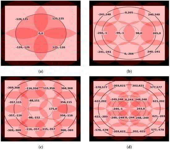 The estimated cluster formatted coverage for the four topology structures using Unity. (a) 5 MECs allocation in 500 × 500 m using unity; (b) 10 MECs allocation in 700 × 700 m using unity; (c) 15 MECs allocation in 1000 × 1000 using unity; (d) 20 MECs allocation in 1500 × 1500 using unity.