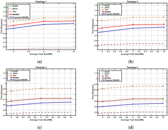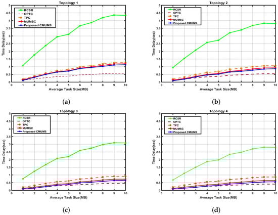 Time Delay vs. Average Task Size in four topology structures. (a) Time delay vs. Average task in 1st topology; (b) Time delay vs. Average task in 2nd topology; (c) Time delay vs. Average task in 3rd topology; (d) Time delay vs. Average task in 4th topology.