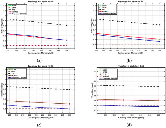Cross-section of Time Delay vs. Q up to 250 MB in topology 4 at different . (a) Time delay vs. Q up to 250 MB; (b) Time delay vs. Q up to 250 MB; (c) Time delay vs. Q up to 250 MB; (d) Time delay vs. Q up to 250 MB.