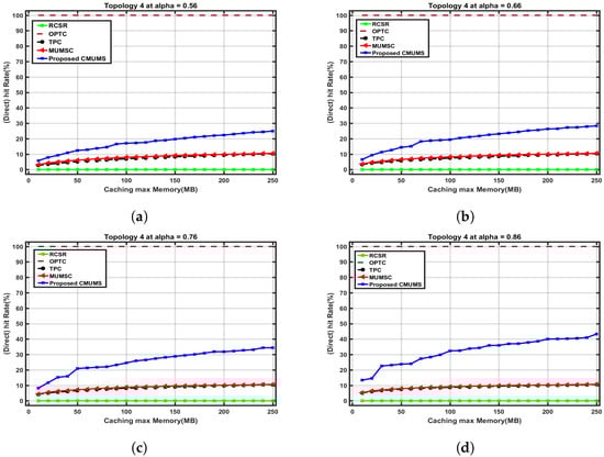 Direct hit rate vs. caching max Memory (Q) up to 250 MB at different . (a) Direct hit rate vs. Q (at = 0.56 as per []); (b) Direct hit rate vs. Q at = 0.66; (c) Direct hit rate vs. Q at = 0.76; (d) Direct hit rate vs. Q at = 0.86.